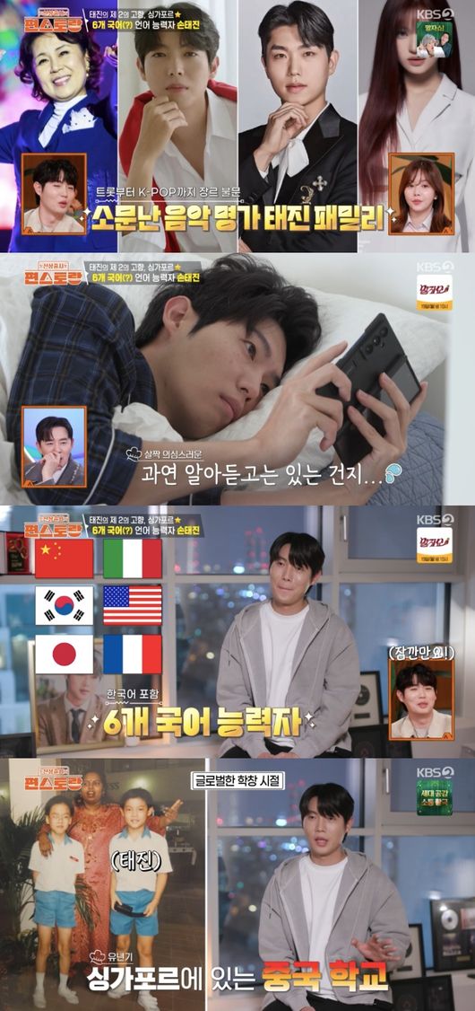 그렇게 손태진은 싱가포르에 있는 중국어 학교, 한국학교를 다닌 뒤 중, 고등학교에는 미국 학교를 다니며 언어를 습득했다고. 게다가 호텔경영을 위해 프랑스 대학에 붙었지만 고민 끝에 서울대 성악과에 다니게 됐며 손태진은 “이탈리아 유학을 다니면서 다양한 문화를 접하면서 컸다”라고 전헀다.