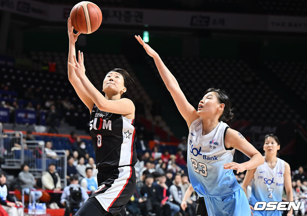 부산 BNK 이원정이 인천 신한은행 홍유순의 마크를 피해 골밑슛을 시도하고 있다. 2026.01.18 / foto0307@osen.co.kr