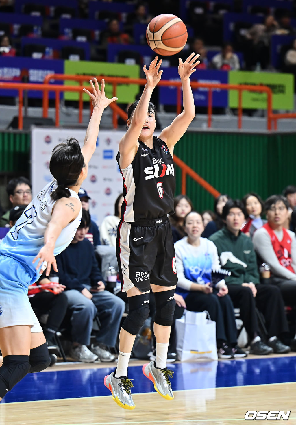 부산 BNK 이소희가 인천 신한은행 신지현의 마크를 피해 3점슛을 시도하고 있다. 2026.01.18 / foto0307@osen.co.kr