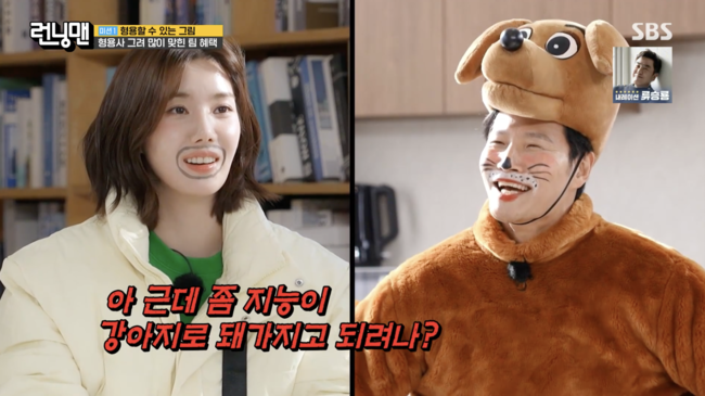 김종국은 얼굴볼 획득에 성공한 뒤 문제 풀이에 나섰고, 이때 같은팀 권은비는 김종국에 “근데 좀 지능이 강아지로 돼가지고 되려나?”라고 의심해 웃음을 자아냈다.