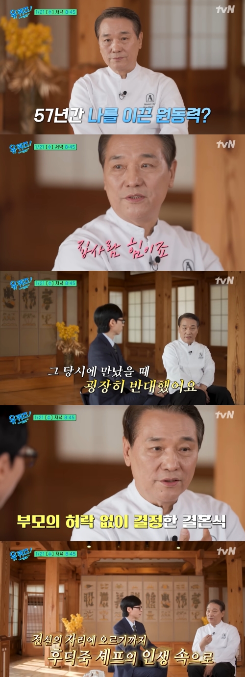 유재석은 "57년 동안 날 이끌었던 원동력은?"이라고 물었고, 후덕죽 셰프는 "집 사람의 힘"이라며 "그 당시에 (아내와) 만났을 때 굉장히 반대했다"고 밝혔다.