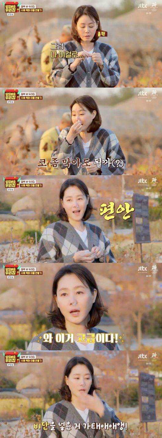 목화를 따며 콧물을 흘리던 김성령은 “탈지면에 사용하는 것과 같은 것이냐”라고 물었다. 원하던 대답을 들은 김성령은 목화를 돌돌 말아 콧구멍에 꽂았고, “비단을 넣은 것 같다. 콧물이 이제 안 나올 것 같다”라며 높은 만족도를 드러냈다.