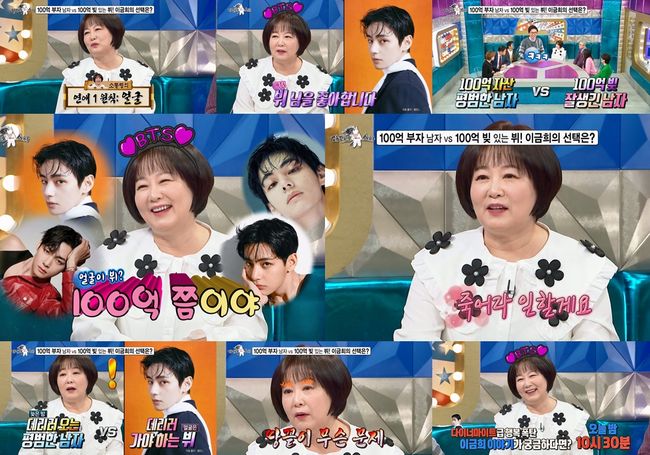 이어 이금희는 연예계 대표 아미인 만큼 자신의 이상형이 BTS 뷔라고 밝힌다. 이에 MC 김국진과 유세윤은 “이금희 씨만큼은 사람 마음을 보고 그러실 줄 알았는데…”라며 놀리며 이금희의 솔직한 모습에 놀라기도 한다.
