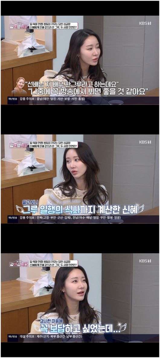 황신혜는 “내가 한그루를 본 적이 있다”라며 한그루와의 인연을 밝혔다. 한그루는 “내가 친구랑 식사하다가 황신혜 선배를 봤다. 이진이랑 밥을 먹고 있었다. 방송 때 보면 좋겠다고 인사를 했는데, 황신혜가 우리 테이블 계산을 다해주고 가셨더라. 심지어 내가 또 잘 먹어서 많이 먹었는데 그걸 다 계산해주셔서 너무 감사하고 죄송했다”라며 황신혜의 미담을 전했다.