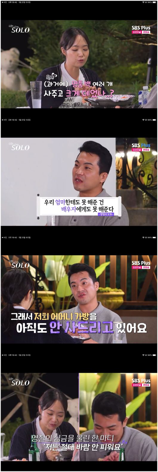정숙은 “사치 좋아하는 여자 싫다고 해서 명품 백 여러 개 사주고 크게 데였나, 싶었다”라며 솔직히 물었다. 영철은 “내 모토는 우리 엄마한테도 못 해 준 걸 와이프한테도 못 해준다는 거다. 그래서 저희 어머니 가방을 아직도 안 사드리고 있다”라면서 “아까 정숙이 한 말이 크게 와닿았다. 바람은 안 피운다고”라며 정숙에게 끌리는 이유를 밝혔다. 이어 정숙이 통금이 있었다는 부분에서 영철은 "정숙은 명품이다"라며 감탄했다.