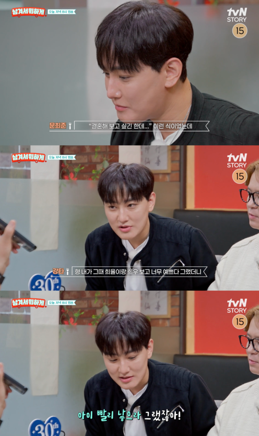 이날 결혼 계획을 묻는 질문에 강타는 최근 겪은 일화를 꺼냈다. 그는 “얼마 전 공연을 했는데 희준이 형이 형수님과 아이들을 데리고 왔다. 다 같이 인사를 하러 갔는데, 형이 형수님을 자연스럽게 ‘여보’라고 부르더라”며 “그 한마디가 굉장히 크게 와 닿았다”고 고백했다.
