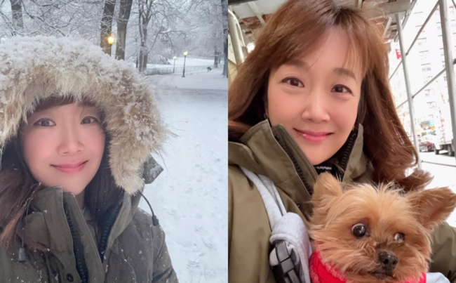 이어 "눈 많이 내린날 샐카 한장. 추워서 늘 제 품에 캥거루 처럼 아기는 진져랑..남편이랑 찍은 사진도 올려봅니다"라고 반려견, 남편과 함께 찍은 사진을 함께 공개했다.