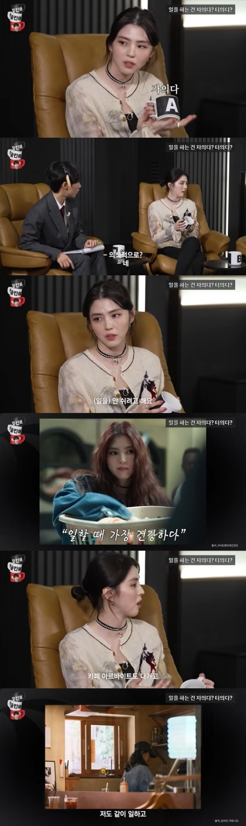 한소희는 "일주일 쉬라고 하면 카페 알바도 나간다"고 했고, 재재는 "지금? 카페 알바를 한다고"라며 놀랐다. 이에 한소희는 "시간 날 때마다 친구가 일하는 카페에 나가서 나도 같이 일 한다. 옛날에 알바할 때도 일의 능률이 올라가는 게 기분이 좋았다. 난 자의라고 생각한다"고 덧붙였다.