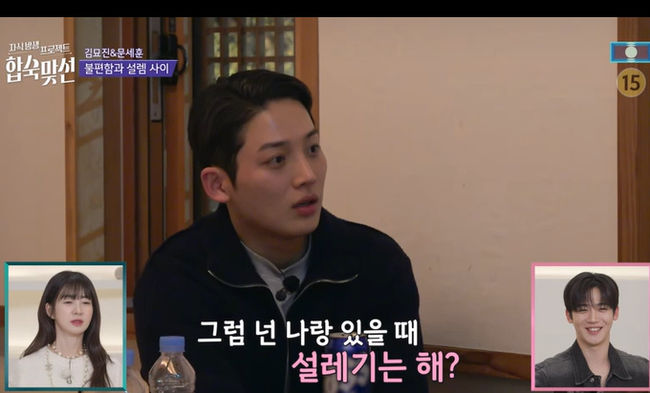 이런 가운데 22일 방송된 ‘합숙맞선’에서는 출연자 김묘진과 문세훈의 감정선이 이어졌다. 문세훈은 김묘진의 질문에 “염두에 둔 사람은 너 아니면 ○○ 누나”라며 “네가 확실히 있었다”고 말했고, 김묘진은 “기분이 마냥 좋지는 않았다”며 복잡한 심경을 드러냈다.