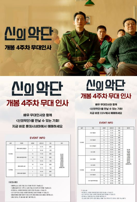 이어 25일에는 경기 북부와 서울을 아우르는 광폭 행보를 보인다. ▲CGV의정부 ▲롯데시네마 노원 ▲CGV중계 ▲CGV상봉 ▲롯데시네마 청량리 ▲CGV왕십리 ▲CGV용산아이파크몰을 방문, 개봉 한 달이 되어감에도 식지 않는 열기를 보여주는 관객들과 뜨겁게 소통하며 4주 차 주말의 피날레를 장식할 계획이다.
