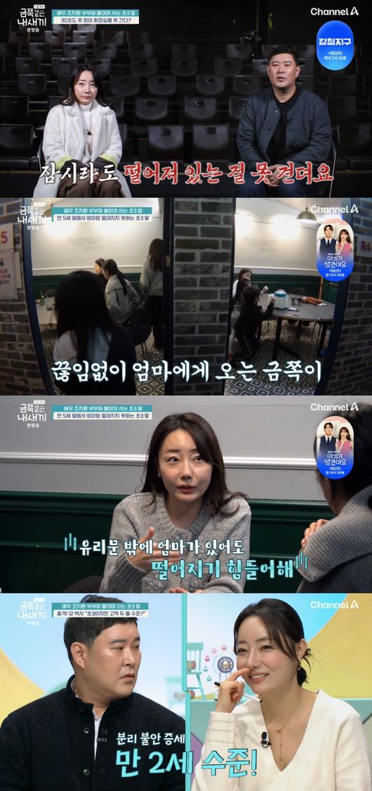 이날 스튜디오에는 배우 조지환과 인플루언서 아내 박혜민이 출연해 육아 고민을 털어놨다. 부부의 고민은 엄마, 아빠와 떨어지면 단 1분도 버티지 못하는 초등학교 3학년 딸 때문이었다. 늘 부모의 곁을 떠나지 못하는 아이의 모습에 배우 조지환 부부는 깊은 걱정을 안고 있었는데.