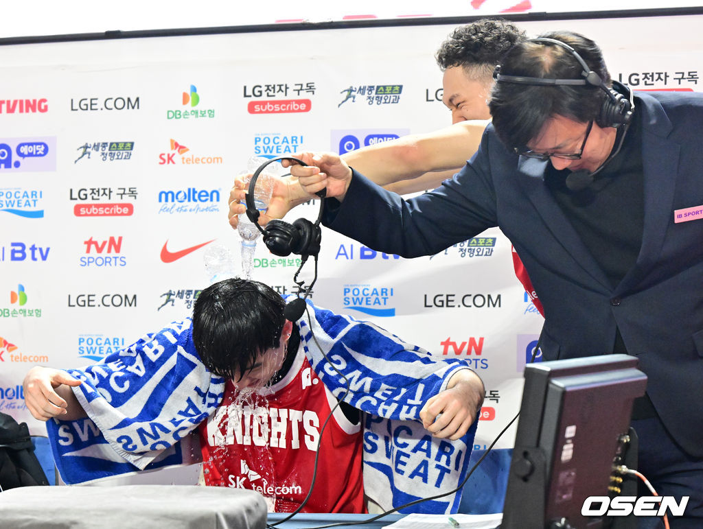 경기를 마치고 SK 김낙현이 방송 인터뷰를 준비하며 다니엘의 물세례를 받고 있다. 2026.01.24 /jpnews@osen.co.kr
