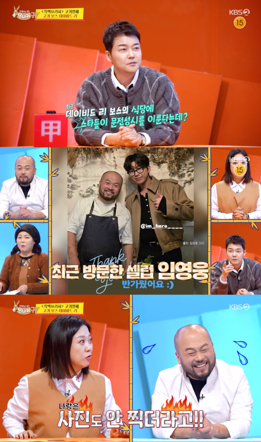 이날 전현무는 “데이비드 리 식당에 최근 스타들이 문전성시를 이루고 있다더라”고 말문을 열었다. “어떤 스타들이 찾았냐”는 물음에 데이비드 리는 “최근에 임영웅 씨가 찾아주셨다. 놀라서 얼굴 빨개졌잖아요”라고 밝혔다. 임영웅과 찍은 사진을 보던 김숙은 “그런데 저는 왜 사진을 안찍어요? 나는 갔는데 사진도 안찍더라고”라며 “이상한 사람이네 진짜”라고 놀렸다.