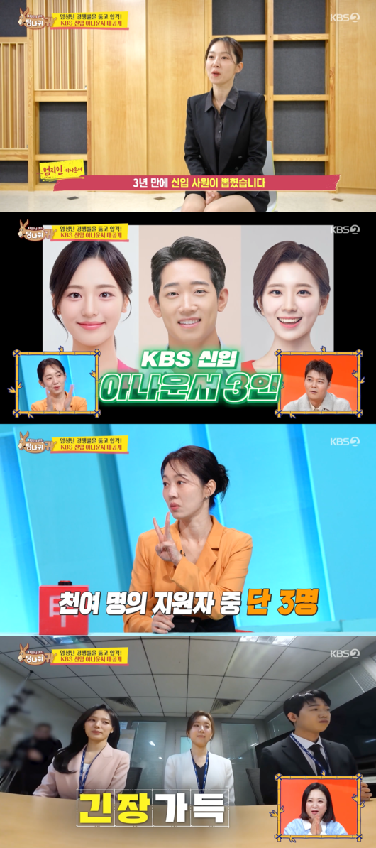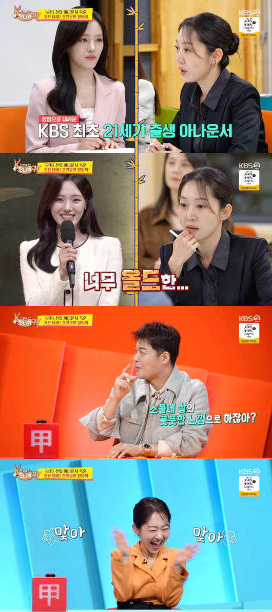다음으로 엄지인 아나운서는 KBS 새로운 신입 아나운서들을 소개했다. 엄지인은 지난해 연말 시상식에서 받은 ‘프로듀서 특별상’에 이어 또 하나 좋은 소식이 있다고. 그는 “2025 한국아나운서대상에서 ‘KBS 사당귀 아나운서팀’이 TV 진행상 예능 부문을 수상했다. 단체상을 받았다”고 자랑했고, 엄지인 아나운서는 새 예능프로그램 진행을 맡게 됐다고 전했다.
