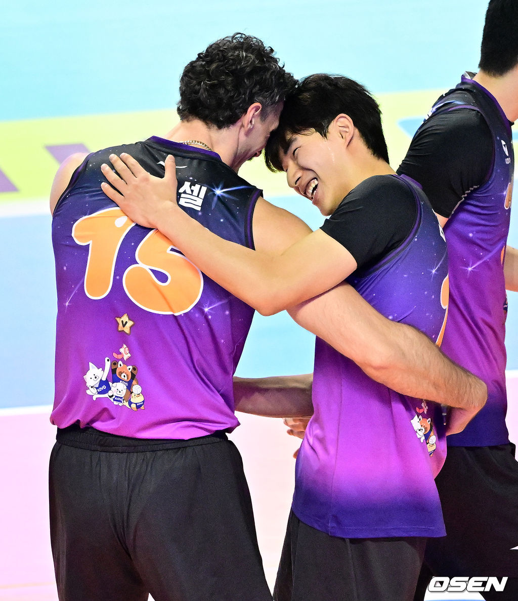 러셀, 김우진이 득점에 기뻐하고 있다. 2026.01.25 /jpnews@osen.co.kr
