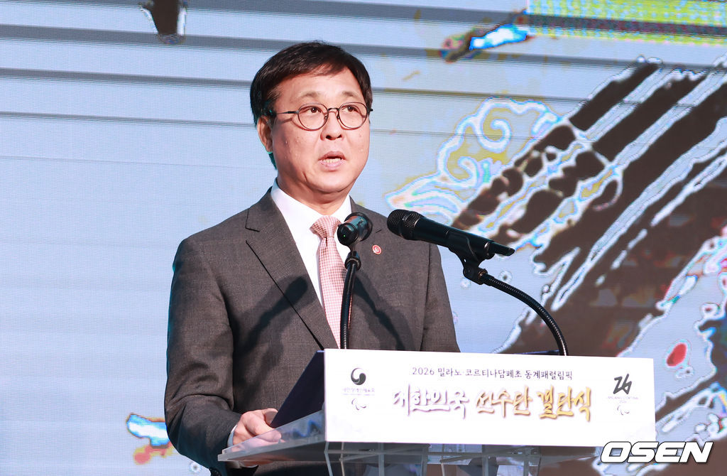 2026 밀라노-코르티나 동계패럴림픽대회 대한민국 선수단 결단식에서 최휘영 장관이 대통령의 축사를 대독하고 있다.2026.02.02 /cej@osen.co.kr