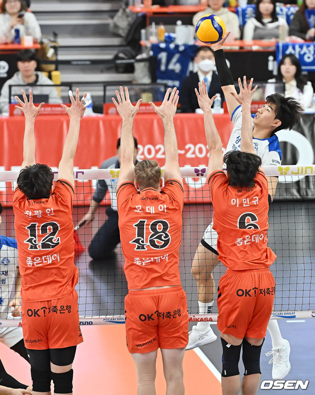 8일 부산 강서실내체육관에서 진에어 2025-2026 V리그 남자부 OK저축은행과 삼성화재의 경기가 열렸다.