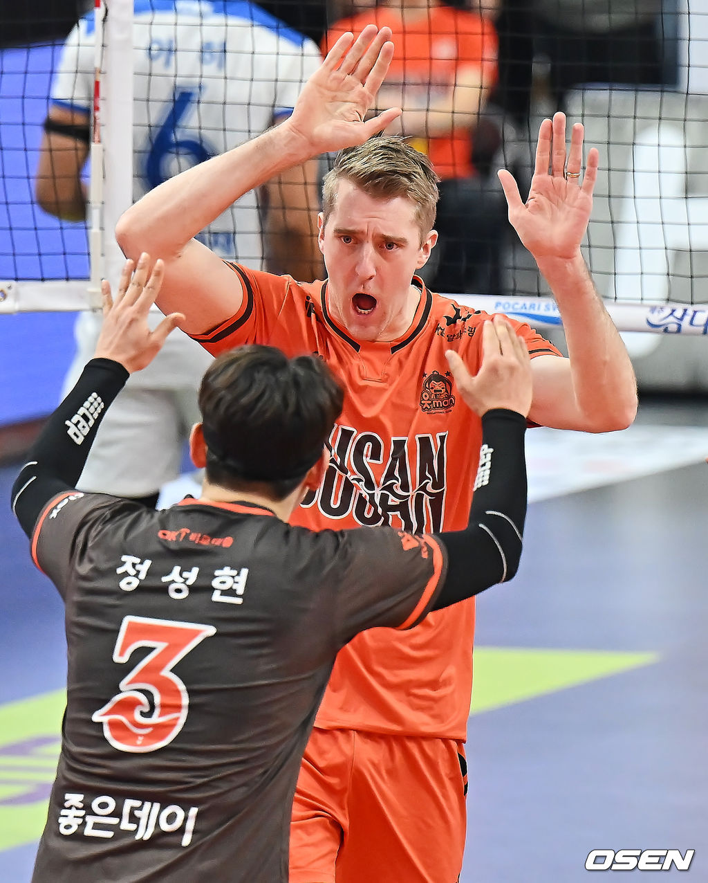 OK저축은행 오데이가 3세트 블로킹 득점으로 승부를 결정 짓고 정성현과 기뻐하고 있다. 2026.02.08 / foto0307@osen.co.kr