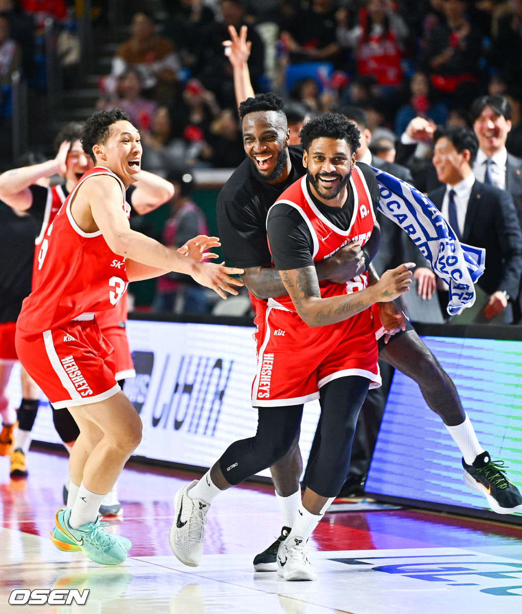 3쿼터 버저비터 3점슛을 성공시킨 서울 SK 대릴 먼로가 동료들과 기뻐하고 있다. 2026.02.11 / soul1014@osen.co.kr