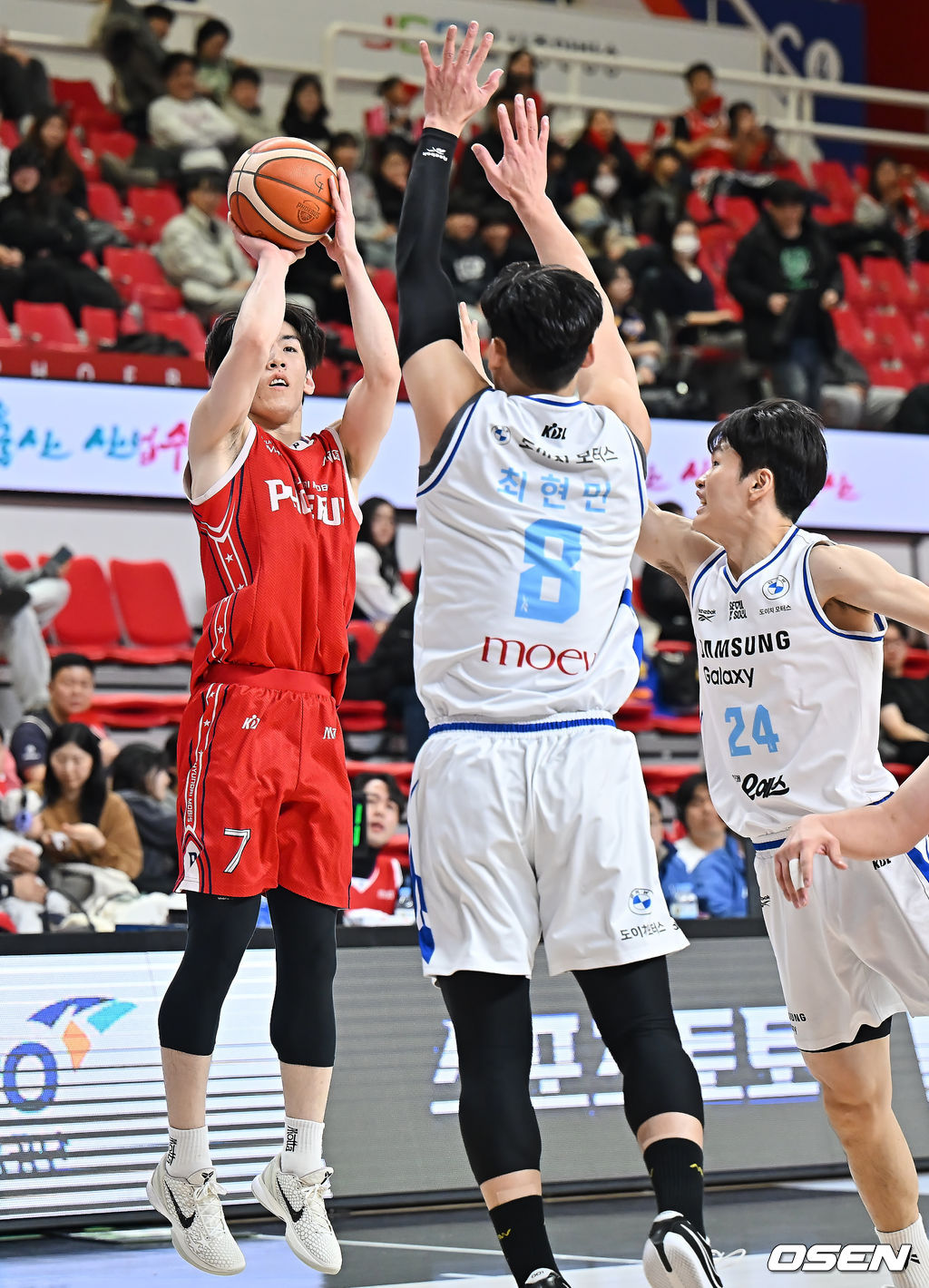 울산 현대모비스 서명진이 서울 삼성 최현민, 신동혁의 마크를 피해 3점슛을 시도하고 있다. 2026.02.12 / foto0307@osen.co.kr