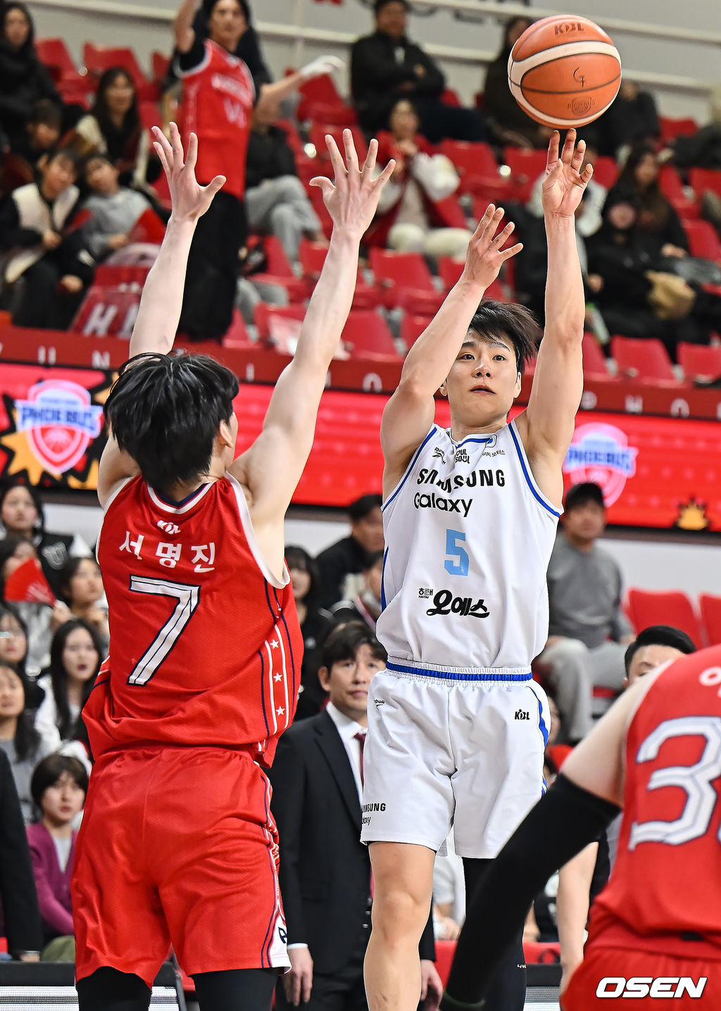 서울 삼성 한호빈이 울산 현대모비스 서명진의 마크를 피해 3점슛을 시도하고 있다. 2026.02.12 / foto0307@osen.co.kr