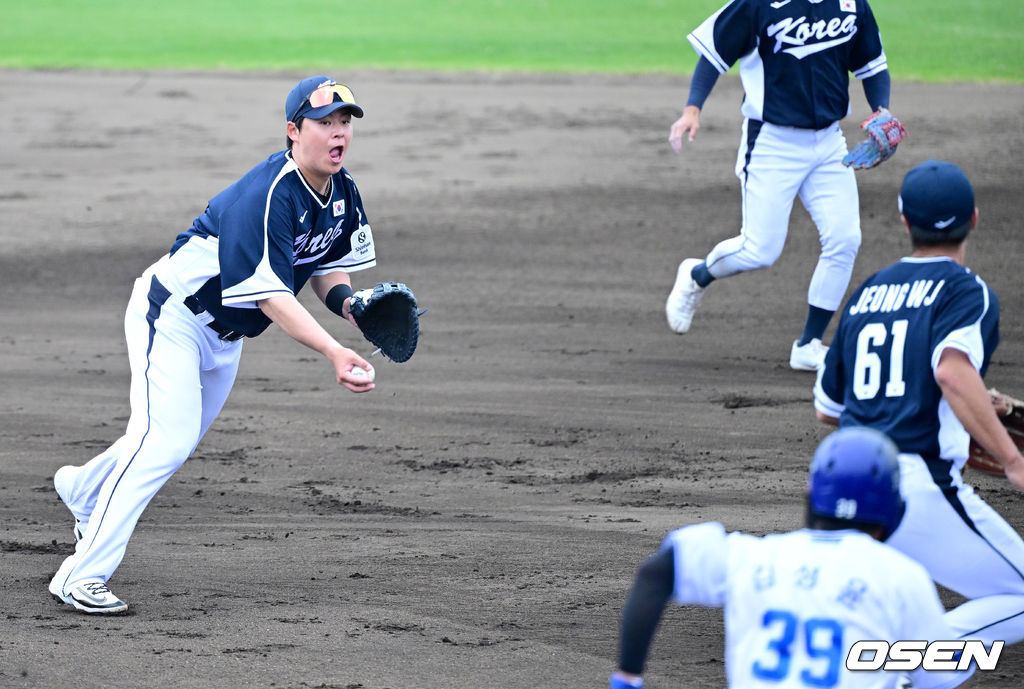 3회말 무사 2루 상황 삼성 김성윤의 내야 땅볼 때 타구를 잡은 대표팀 1루수 노시환이 투수 정우주에게 토스 송구 하고 있다. 2026.02.20 / dreamer@osen.co.kr