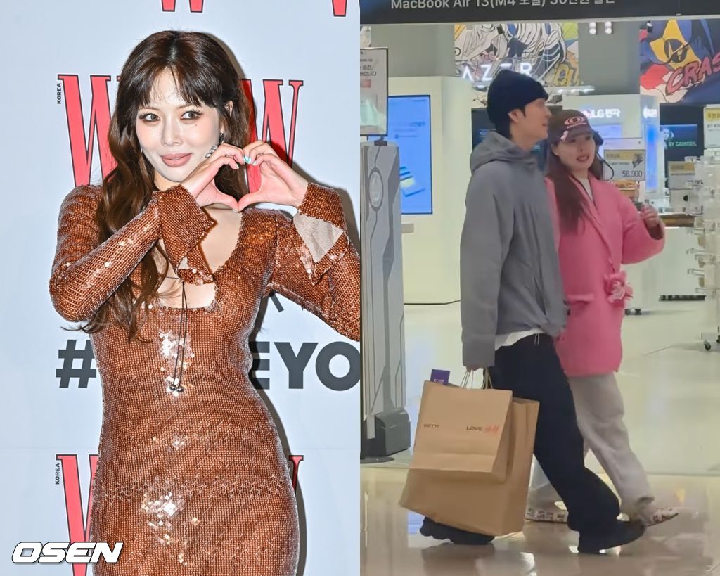 두 사람은 주위를 의식하지 않고 대화를 나누며 쇼핑몰을 걸어다녔다. 다만 핑크색 재킷을 입은 현아가 이전과 달리 살이 오른 모습이라 또 다시 임신설이 불거졌다.