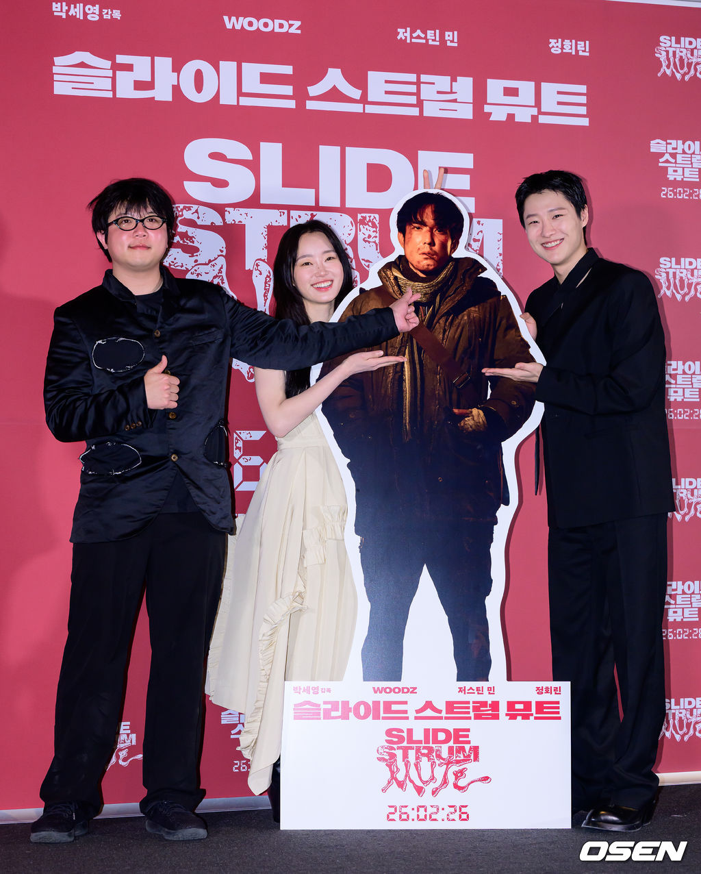 박세영 감독, 배우 정회린, 우즈가 저스틴 민 등신대와 함께 포토타임을 하고 있다. 2026.02.20 /jpnews@osen.co.kr