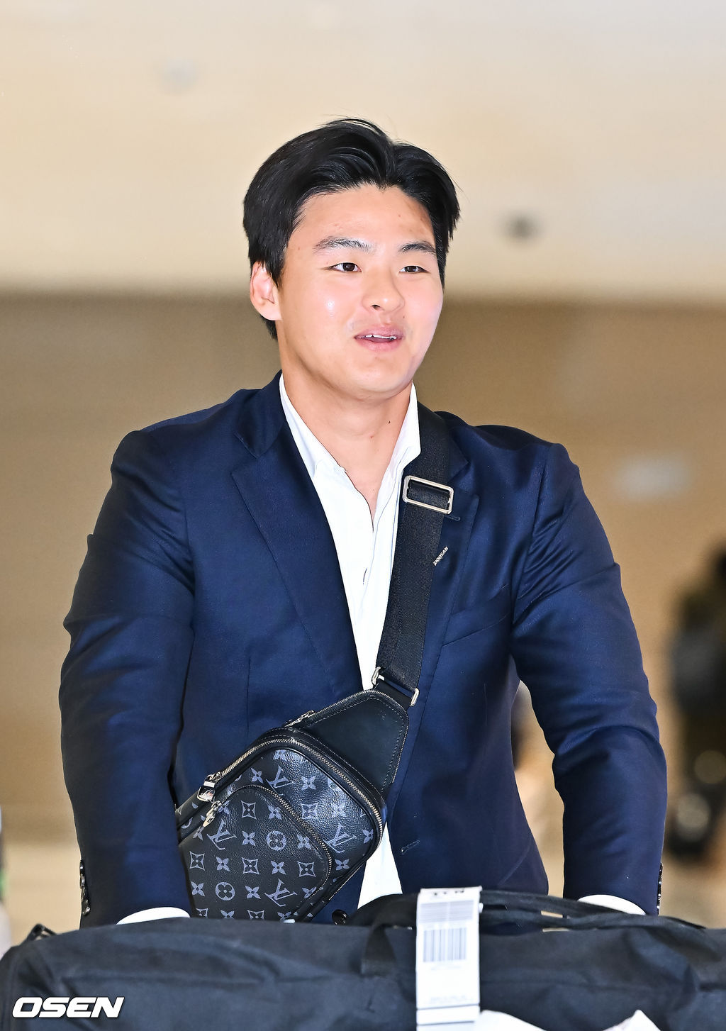 박찬호에게 7번 배번을 양보해 가방을 선물 받았던 이교훈이 가방을 메고 입국장을 나서고 있다. 2026.02.20 / soul1014@osen.co.kr