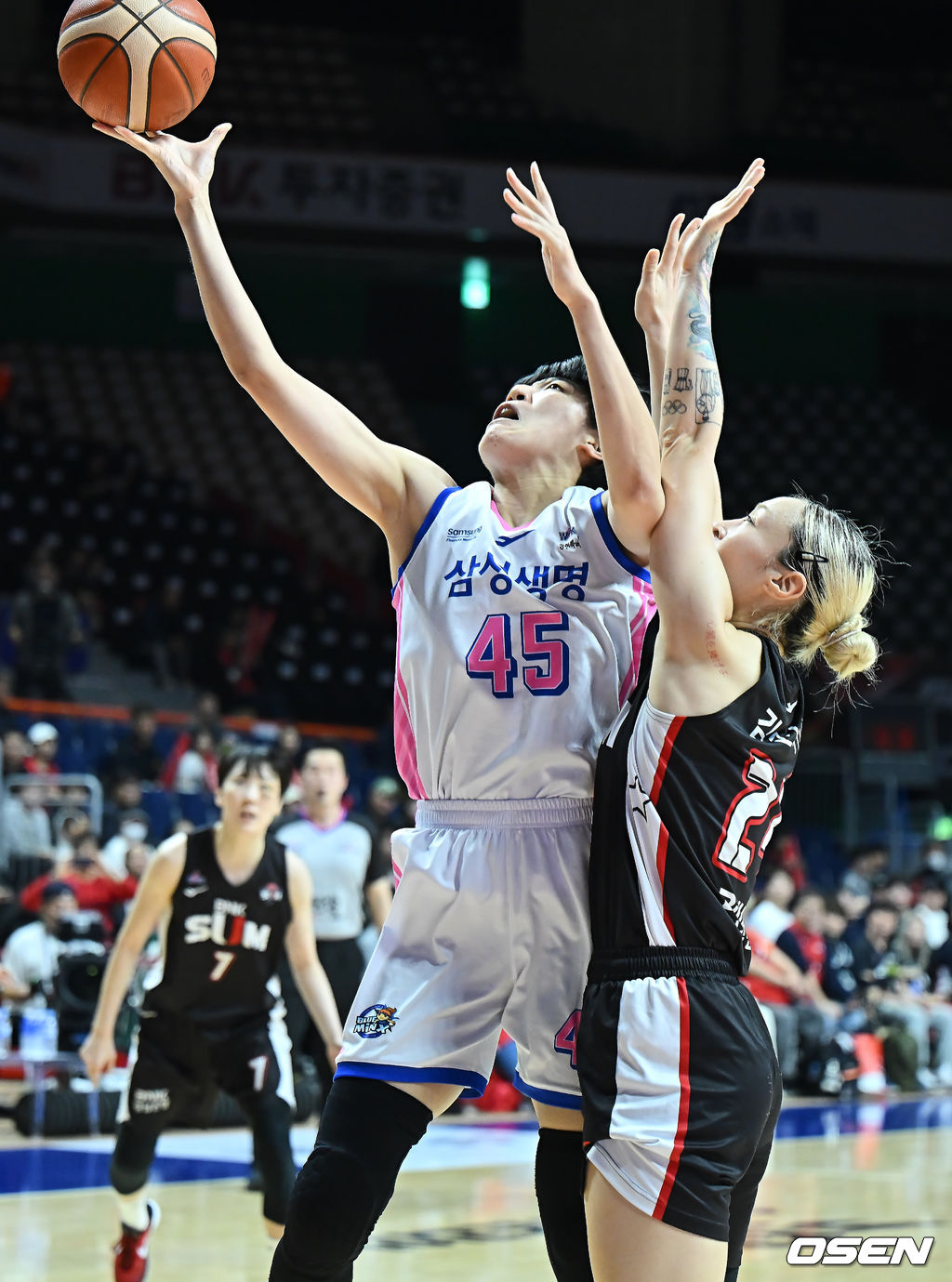 용인 삼성생명 가와무라 미유키가 부산 BNK 김소니아의 마크를 피해 골밑슛을 시도하고 있다. 2026.02.21 / foto0307@osen.co.kr