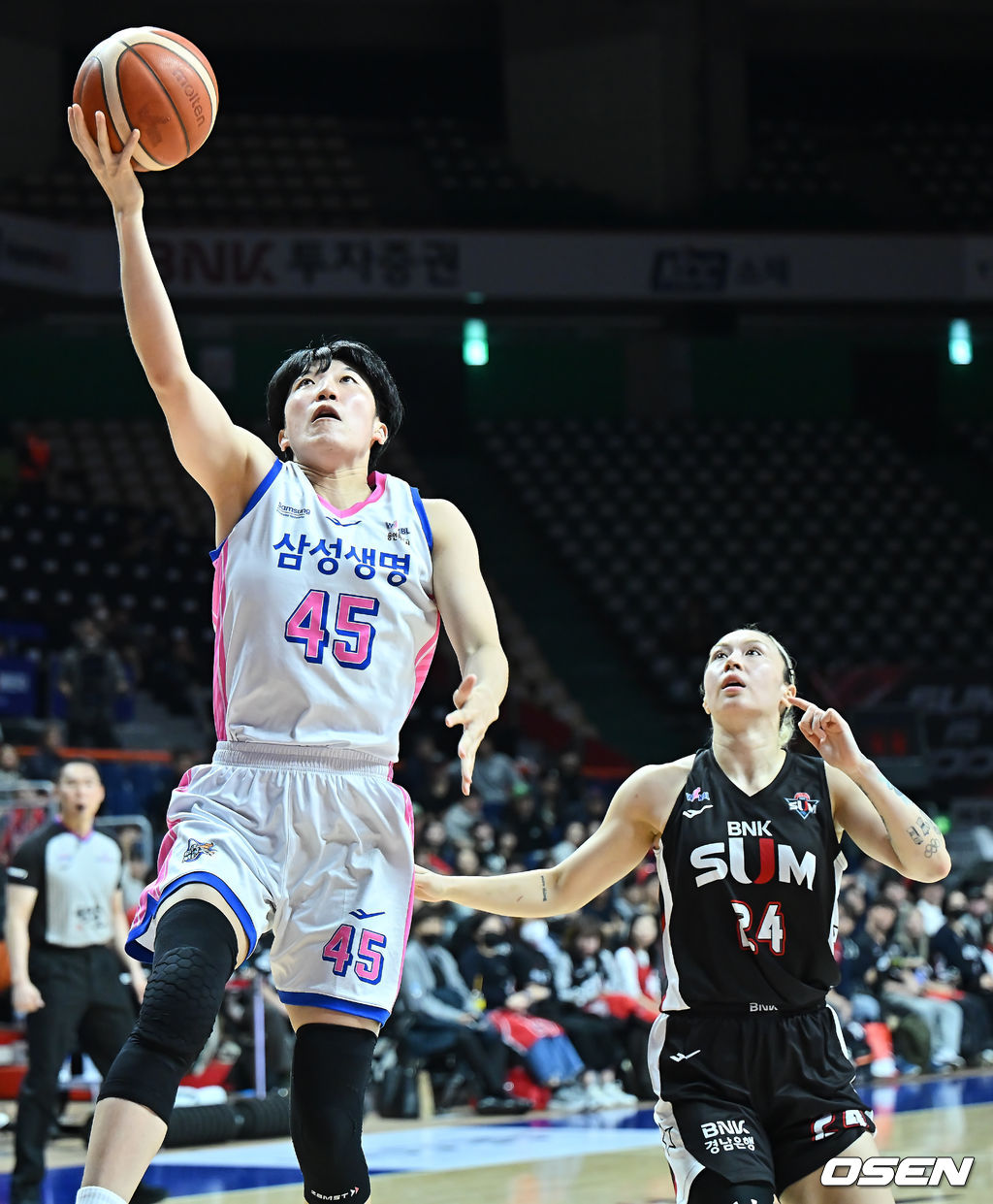 용인 삼성생명 가와무라 미유키가 부산 BNK 김소니아의 마크를 피해 골밑슛을 시도하고 있다. 2026.02.21 / foto0307@osen.co.kr
