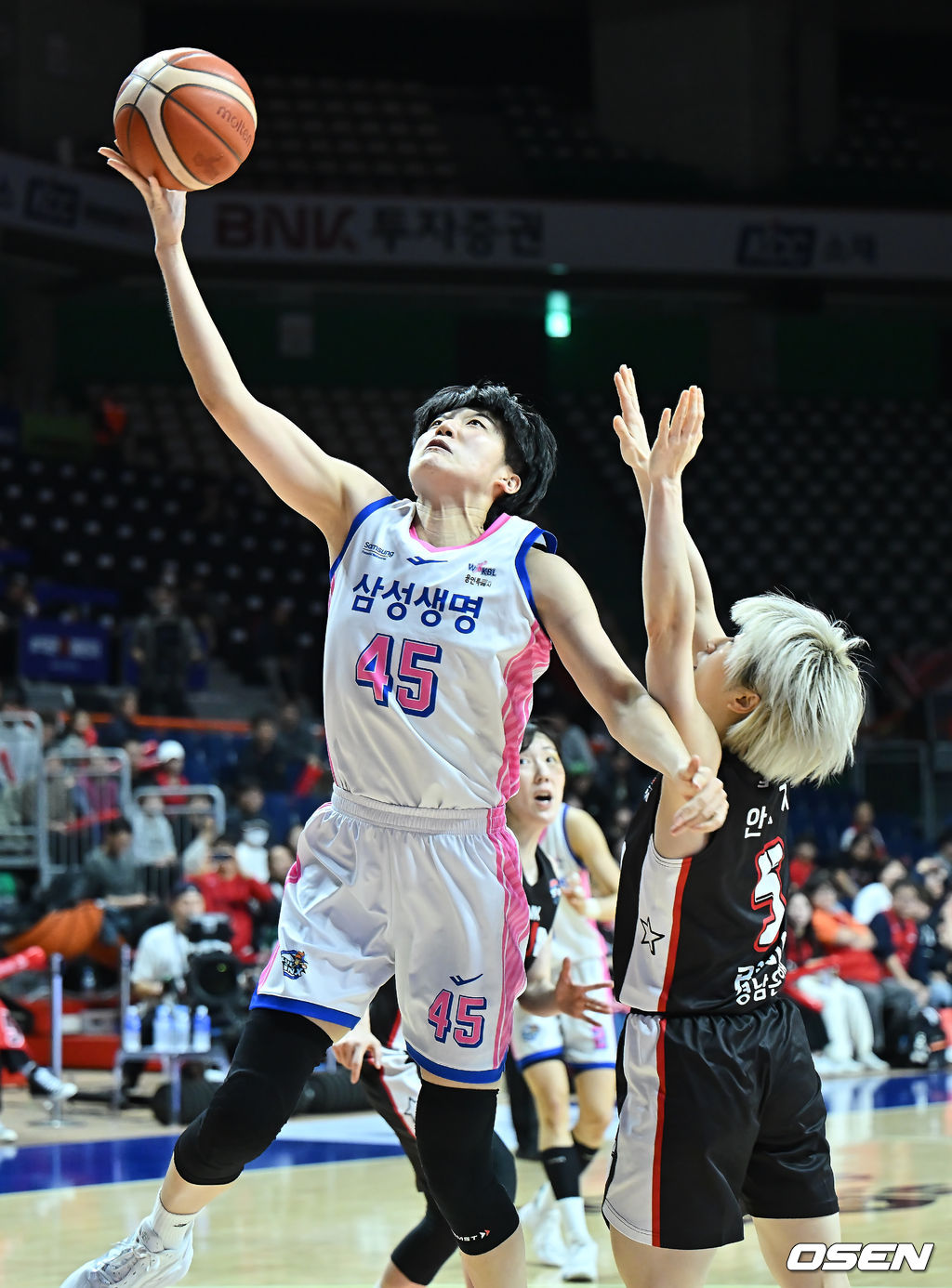 용인 삼성생명 가와무라 미유키가 부산 BNK 안혜지의 마크를 피해 골밑슛을 시도하고 있다. 2026.02.21 / foto0307@osen.co.kr
