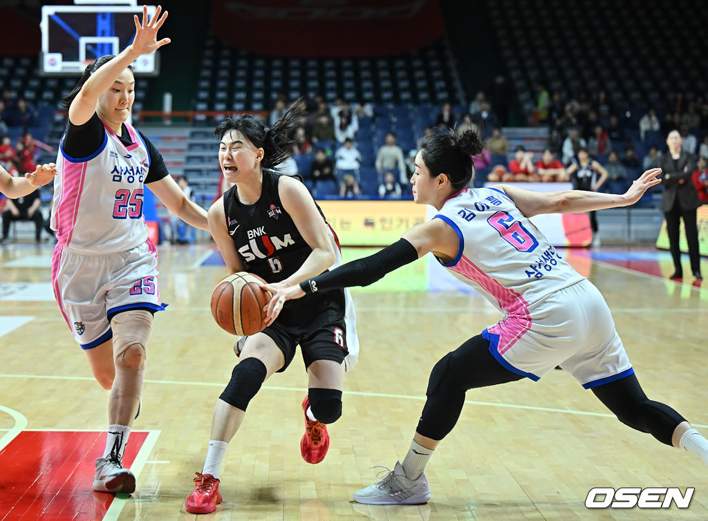 부산 BNK 이소희가 용인 삼성생명 배혜윤, 김아름의 마크를 뚫고 골밑돌파를 시도하고 있다. 2026.02.21 / foto0307@osen.co.kr
