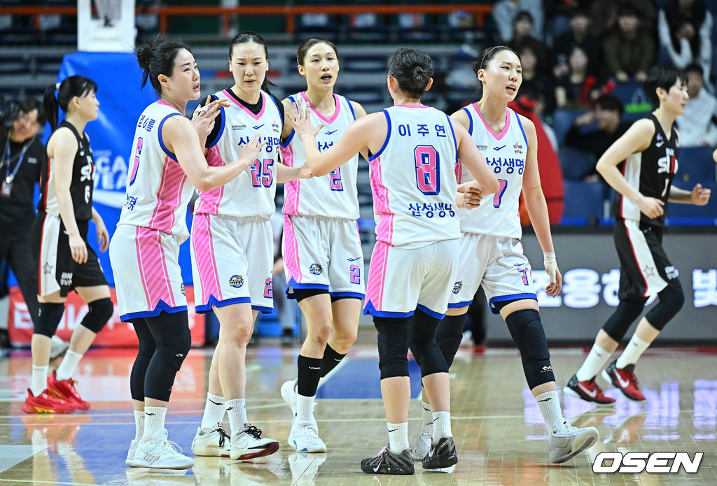 용인 삼성생명 배혜윤이 4쿼터 자유투 2개를 성공하며 역전에 성공한 후 하이파이브를 하고 있다. 2026.02.21 / foto0307@osen.co.kr