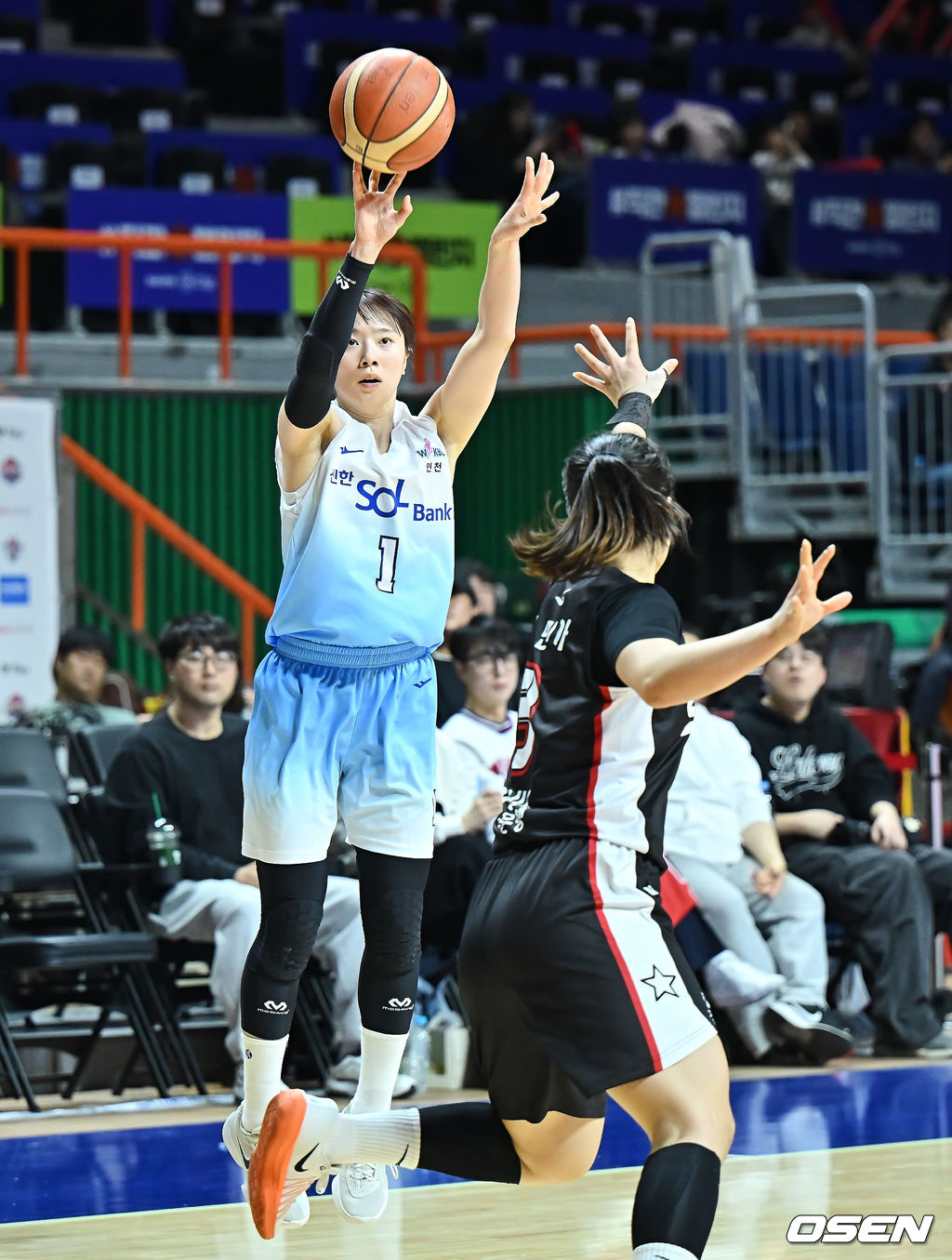 인천 신한은행 신이슬이 부산 BNK 김민아의 마크를 피해 3점슛을 시도하고 있다. 2026.02.22 / foto0307@osen.co.kr