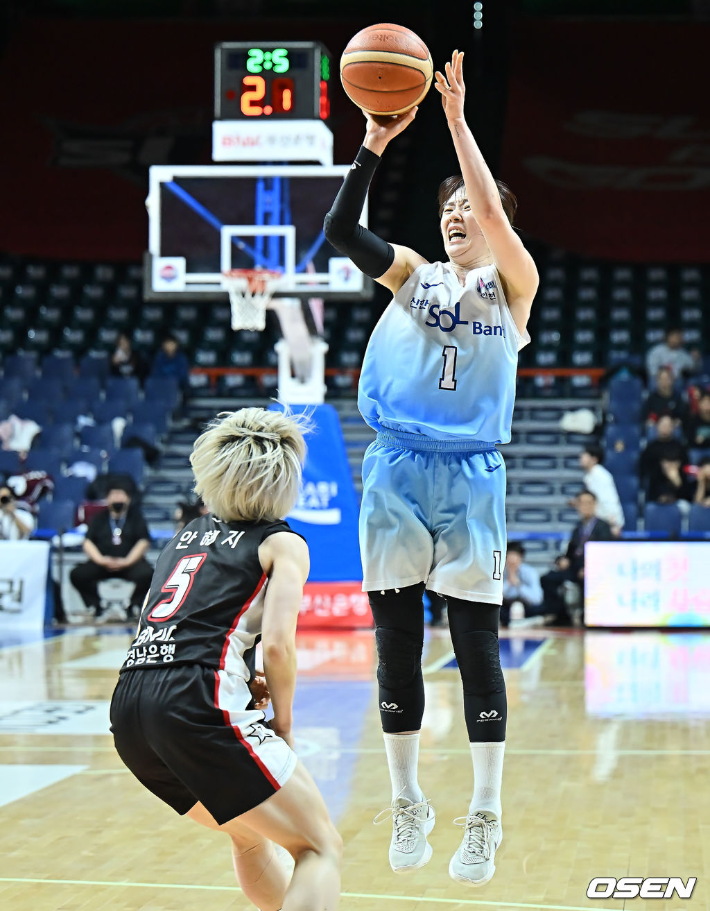 인천 신한은행 신이슬이 부산 BNK 안혜지의 마크를 피해 슛을 시도하고 있다. 2026.02.22 / foto0307@osen.co.kr