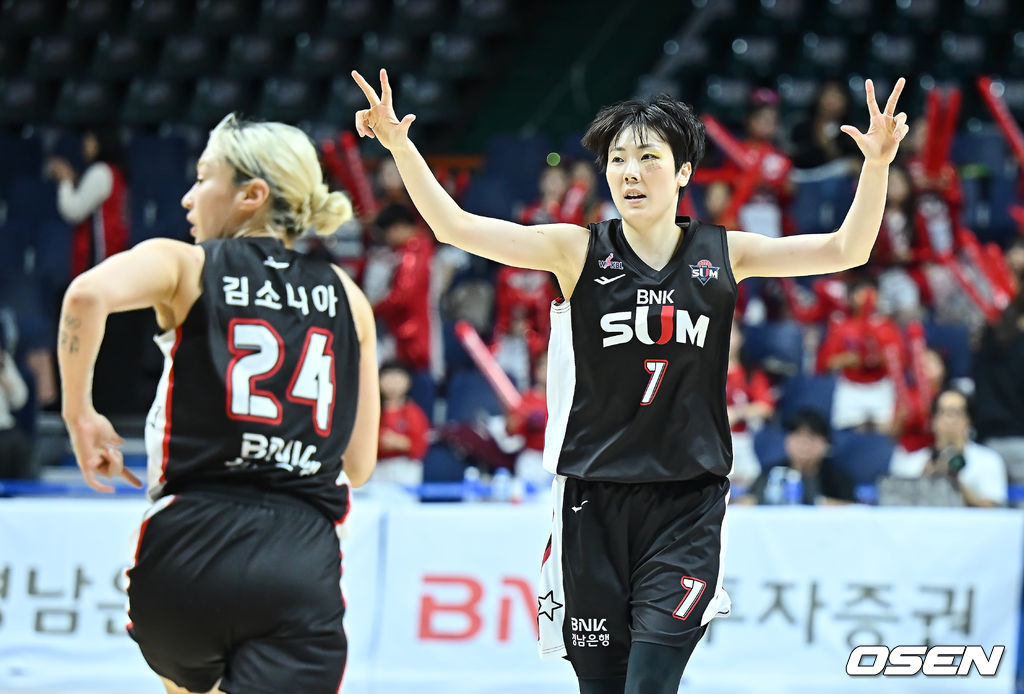 부산 BNK 박혜진이 3점슛을 성공시키고 세리머니를 하고 있다. 2026.02.22 / foto0307@osen.co.kr