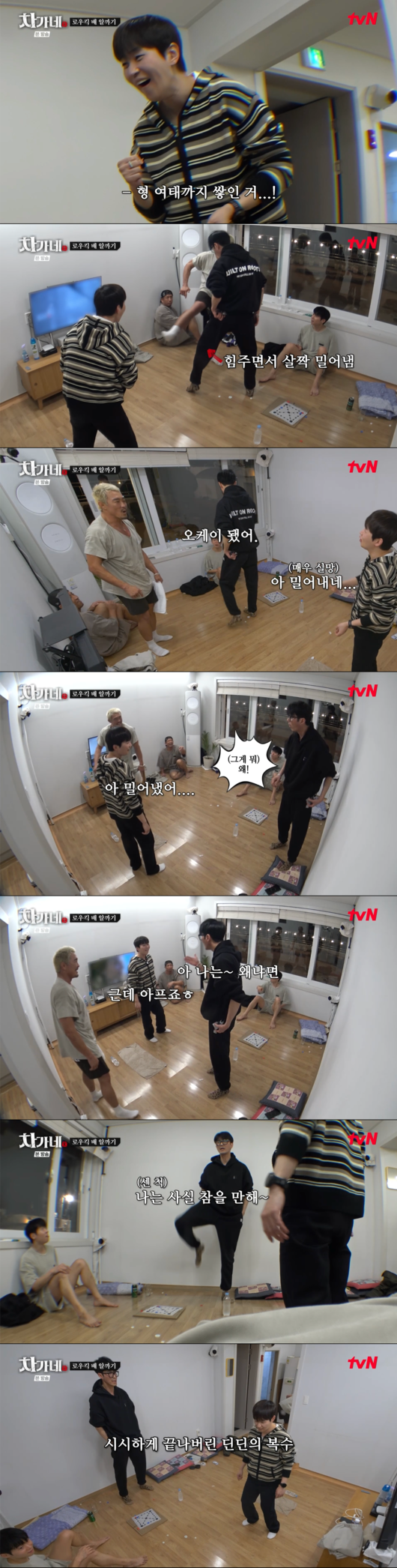 '로우킥 배 알까기' 대결이 펼쳐졌다. 긴장감 넘치는 대결 끝에 딘딘이 승리를 거머쥐었고, 차승원은 벌칙으로 추성훈의 로우킥을 맞게 됐다.