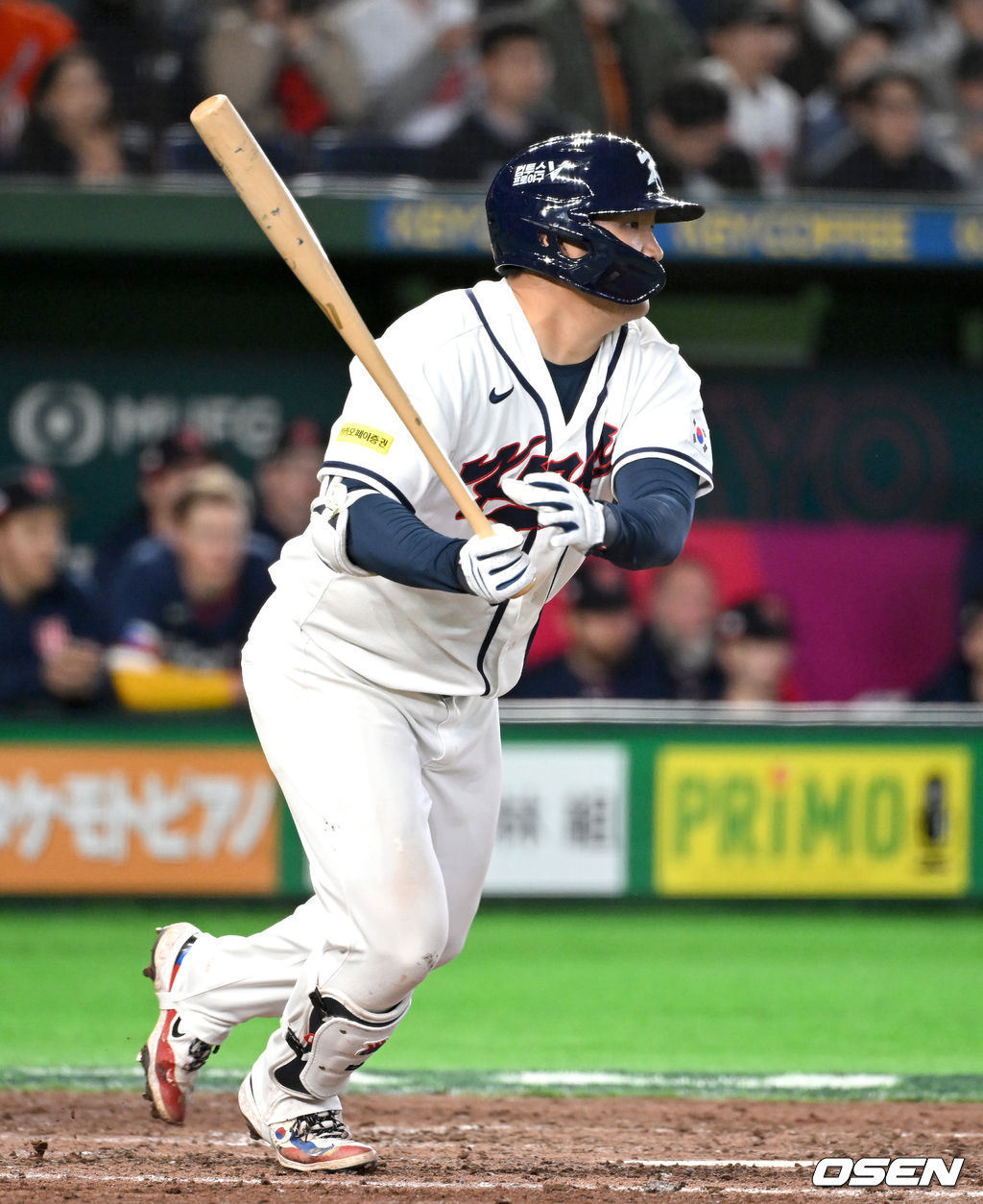 7회말 무사 2루에서 한국 문보경이 적시타를 치고 있다. 2026.03.05 /spjj@osen.co.kr