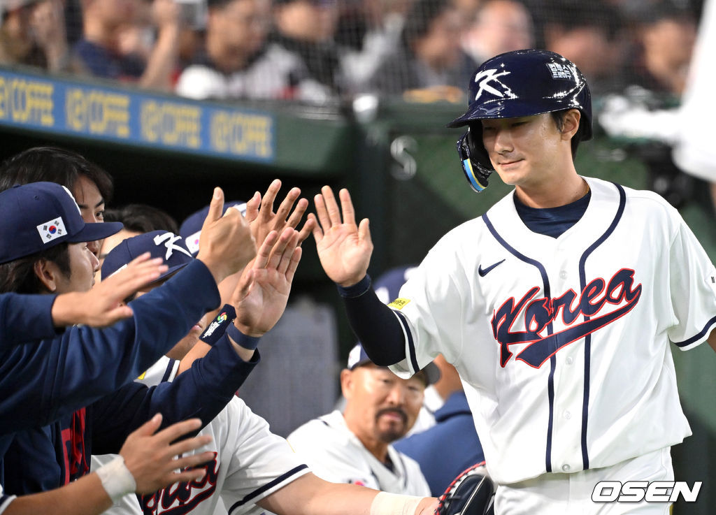 7회말 1사 3루에서 한국 김혜성 땅볼때 홈을 밟은 3루주자 신민재가 더그아웃에서 환호하고 있다. 2026.03.05 /spjj@osen.co.kr