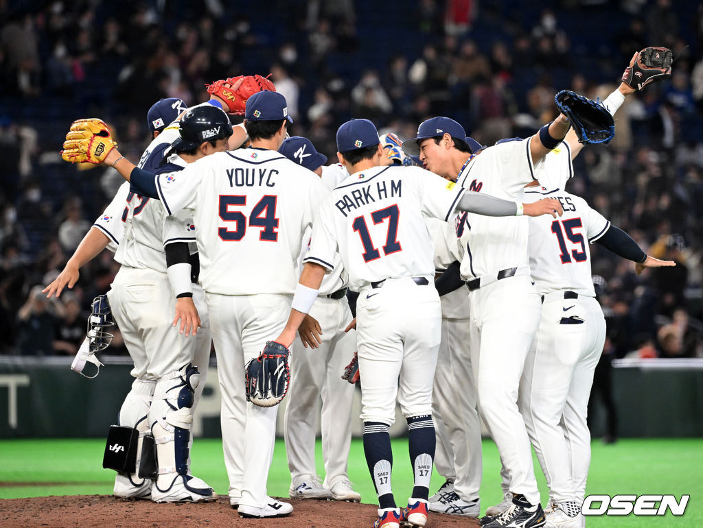 경기 종료 후 한국 선수들이 승리의 기쁨을 나누고 있다. 2026.03.05 /spjj@osen.co.kr