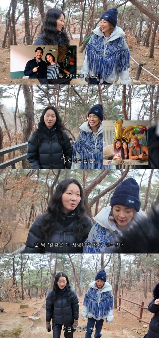 장윤주는 “난 아직까지 남편이랑 잘 지낸다. 사랑한다”라며 “언니가 오빠를 좋아하는 스타일이었던 것처럼 나도 내 남편이 내가 좋아하는 스타일이었다”라고 말했다. 이에 야노시호는 “두 사람이 처음 만났을 때의 사진을 봤다. 완전 멋있었다. 닮았다”라고 반응했다.