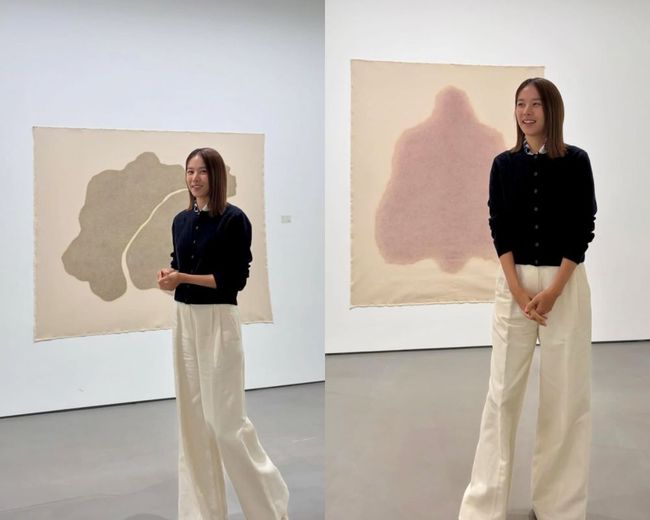 길게 뻗은 팔다리와 시원한 비율이 눈길을 끌며, 자연스럽게 묶은 손동작과 편안한 표정으로 차분한 분위기를 더했다. 특히 대형 작품 앞에 선 모습에서는 군더더기 없는 패션과 늘씬한 실루엣이 어우러져 세련된 매력을 자아냈다.