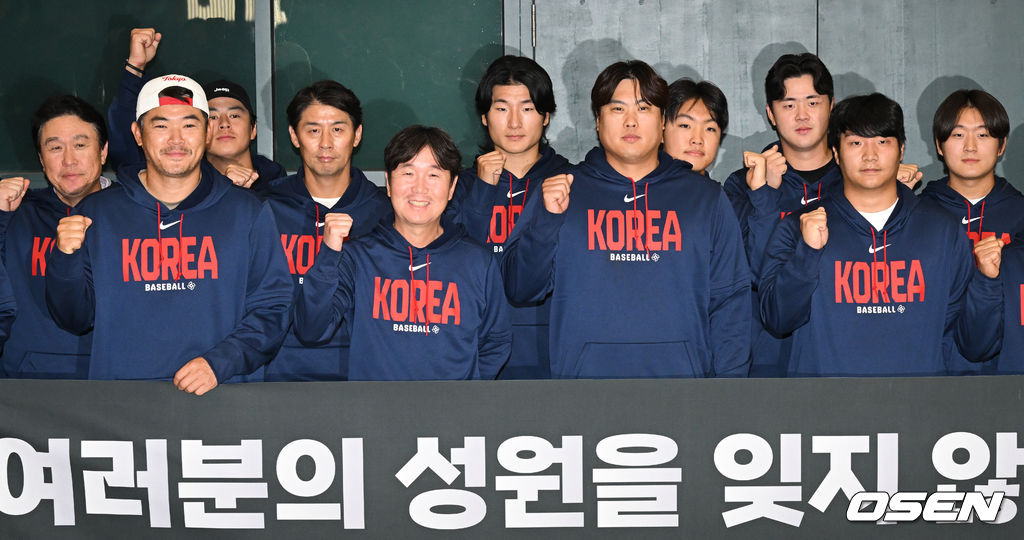 류지현 감독, 노경은, 류현진, 문보경을 비롯한 야구대표팀이 포즈를 취하고 있다. 2026.03.16 /cej@osen.co.kr