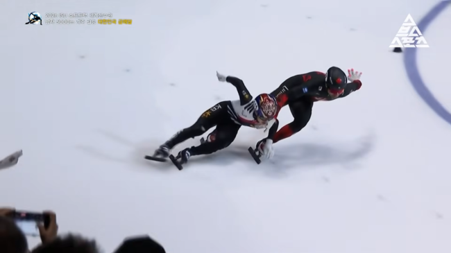 실제로 느린 화면으로 보면 이정민이 마지막 순간 인코스로 파고들자, 막심이 먼저 손을 뻗어 견제하는 모습이 확인된다. 막심은 이정민에게 공간을 내주자 뒤에서 어깨를 잡아당기려 했고, 그 과정에서 중심을 잃으며 넘어졌다. 이정민도 여기에 엉켜 엉덩방아를 찧으며 결승선을 통과했다.