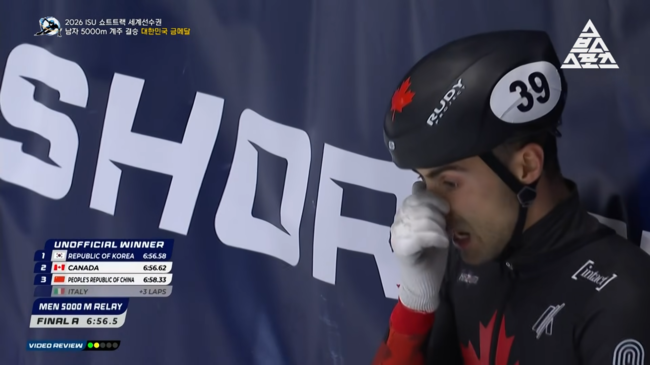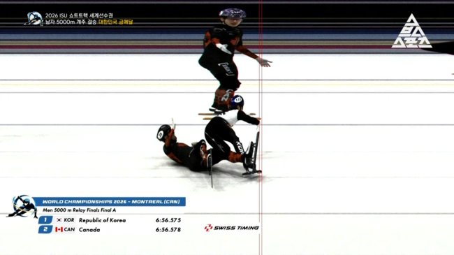 임종언(고양시청), 이정민(성남시청), 황대헌(강원도청), 신동민(화성시청)이 호흡을 맞춘 한국은 16일 캐나다 몬트리올에서 열린 2026 국제빙상경기연맹(ISU) 쇼트트랙 세계선수권대회 5000m 남자 계주 결승에서 가장 먼저 결승선을 통과했지만, 실격 처리됐다.