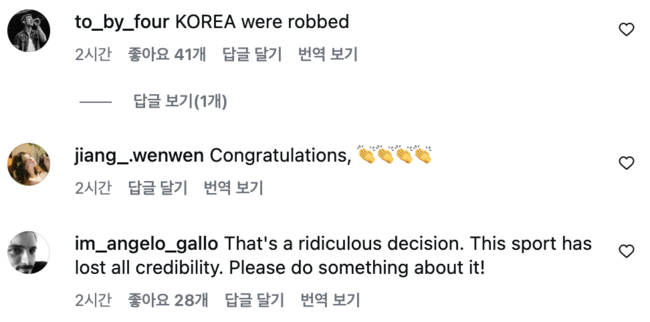 그럼에도 공동 책임이 아니라 한국의 일방적인 실격이 선언된 상황. 해외 팬들도 ISU 소셜 미디어에 "한국은 금메달을 강탈당했다", "어처구니없는 판정이다. 이 스포츠는 신뢰를 잃었다", "솔직히 캐나다는 이 메달을 자랑스러워 할 수 없다", "스포츠의 아름다움이 아니다", "심판 매수다" 등의 댓글을 남기며 편파 판정을 주장했다.