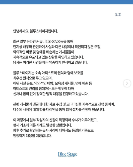 한지상의 입장이 담긴 영상이 공개된 뒤, 소속사도 공지를 올리며 법적 대응을 알렸다. 소속사 측은 “블루스테이지는 소속 아티스트의 권익과 명예 보호를 최우선 원칙으로 두고 있으며, 허위 사실 유포, 악의적인 비방, 모욕성 게시물, 명예 훼손 등 아티스트의 권리를 침해하는 모든 행위에 대해 선처나 합의 없이 강력한 법적 대응을 진행하고 있다”면서 “관련 게시물과 댓글에 대한 자료 수집 및 모니터링을 지속적으로 진행 중이며, 다수의 사례에 대해 법률 대리인을 통해 법적 절차를 진행해 왔다”고 밝혔다.