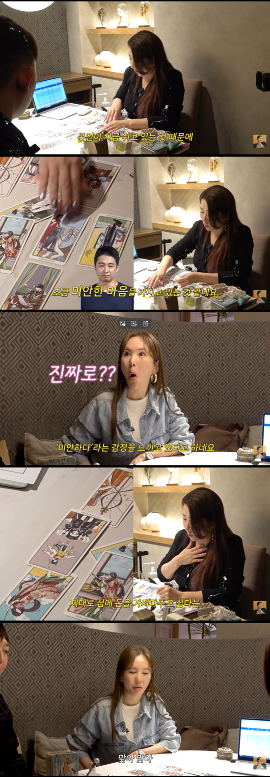 타로 전문가는 "남편분이 지금 쉬고 있는 것 때문에 본인에게 미안한 마음을 가지고 있다. 면목이 없다고 생각한다"는 점괘를 내놓았다. 현재 병원을 그만두고 휴식기를 갖고 있는 남편 한창의 상황을 정확히 짚어낸 것.