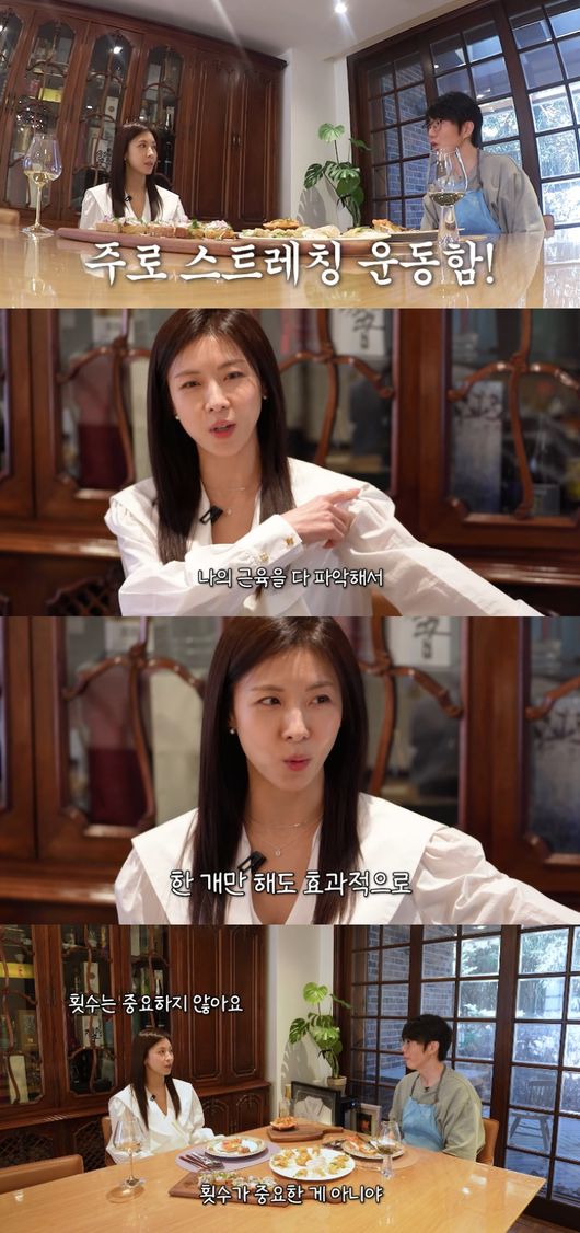 공감한 하지원은 “맞다. 횟수가 중요한 게 아니다.팔을 가늘게 스트레칭 하는 게 아니라 정확한 포인트에 힘을 딱 주고 걔가 늘어난다고 신호를 보낸다. 뭔가 명상처럼 자기 몸이랑 대화해야 한다”고 말했다.